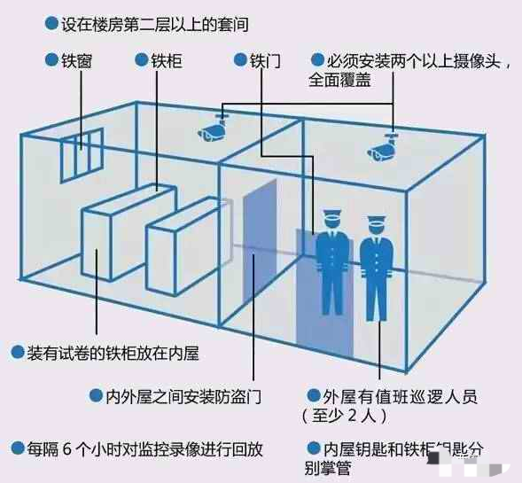 根據(jù)《規(guī)定》要求,省、地(市)、縣(區(qū))級(jí)教育考試機(jī)構(gòu)都應(yīng)當(dāng)建立試卷保密室。試卷保密室必須設(shè)在樓房的第二層以上,必須是鋼混(或者磚混)結(jié)構(gòu)的套間。要做到防盜、防火、防潮、防鼠,并配備鐵門(mén)、鐵窗、鐵柜(鐵柜數(shù)量以能夠滿足分科存放全部試卷為準(zhǔn))。