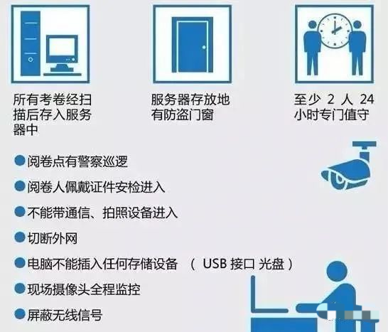 評(píng)卷期間,評(píng)卷場(chǎng)所的監(jiān)控?zé)o死角,關(guān)鍵崗位實(shí)行“一崗多控”。