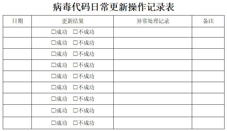 (3)在涉密計(jì)算機(jī)病毒防護(hù)方面,信息化管理部門(mén)要及時(shí)更新病毒與惡意代碼防護(hù)產(chǎn)品特征庫(kù),單臺(tái)涉密計(jì)算機(jī)至少兩周更新一次,并且要定期對(duì)病毒和惡意代碼進(jìn)行查殺(每個(gè)月不少于1次,全系統(tǒng)或全盤(pán)查殺),及時(shí)清除病毒隔離區(qū)。處于長(zhǎng)期不使用、歸庫(kù)、維修和待報(bào)廢等狀態(tài)的涉密計(jì)算機(jī),以及集中管理的便攜式涉密計(jì)算機(jī),信息化管理部門(mén)要在重新啟用或者設(shè)備借出前更新特征庫(kù),并進(jìn)行病毒與惡意代碼查殺后,再交于使用責(zé)任人啟用或者借用。信息化管理部門(mén)執(zhí)行的更新病毒與惡意代碼防護(hù)產(chǎn)品特征庫(kù)的工作內(nèi)容,需要詳實(shí)地填寫(xiě)在《病毒代碼日常更新操作記錄表》中,以備追溯。