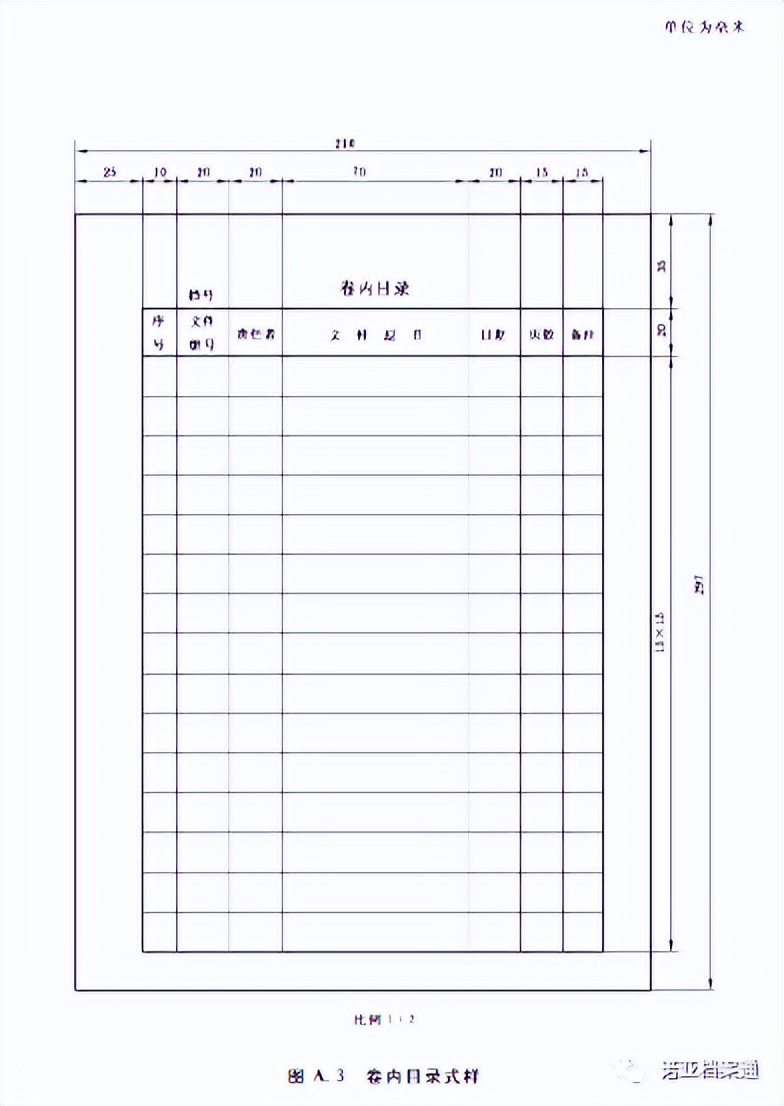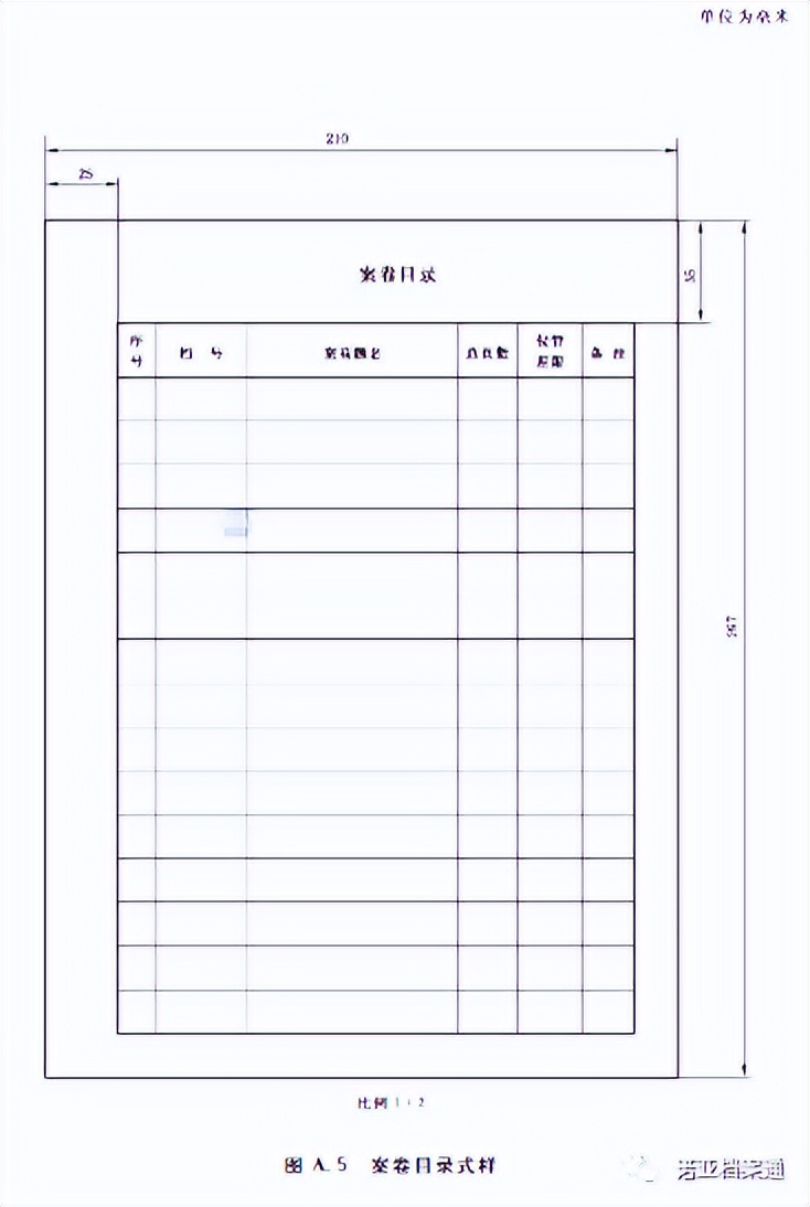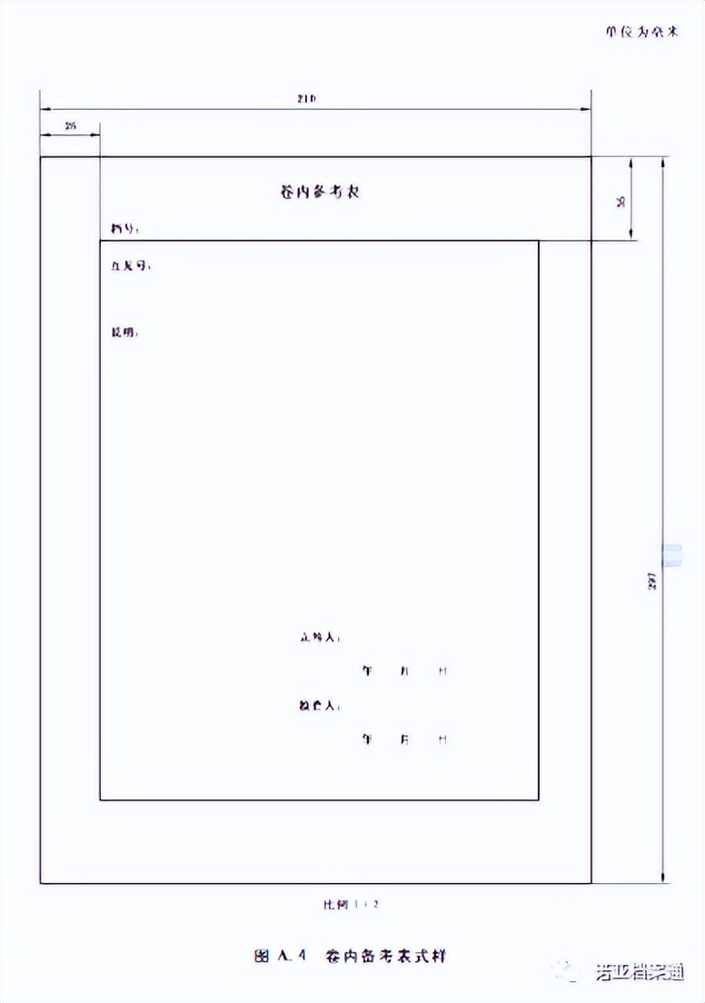 案卷目錄、卷內目錄、卷內備考表表格規(guī)格為:297mm×210mm。表格宜采用70g以上白色書寫紙制作。