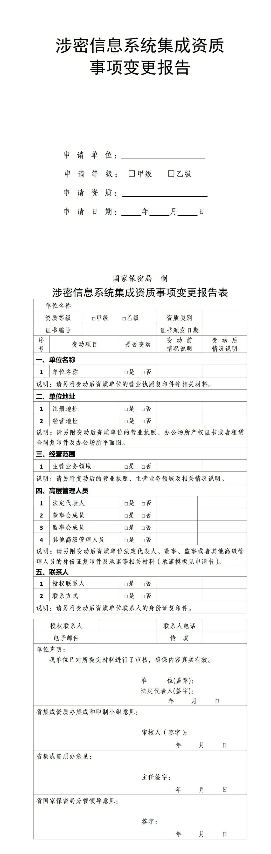 1.涉密信息系統(tǒng)集成資質(zhì)變更報(bào)告表(含封面,加蓋資質(zhì)單位公章)