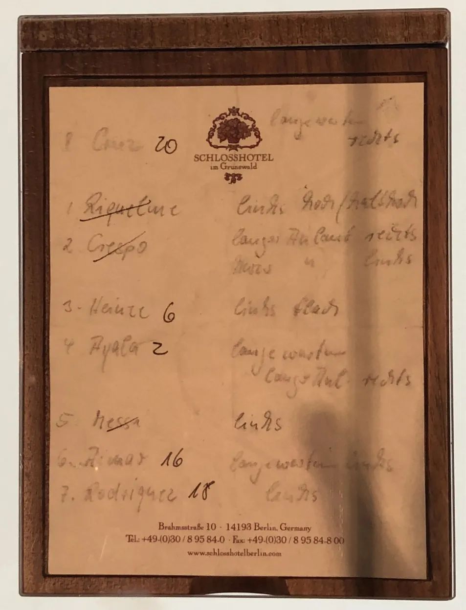 德國守門員教練科普克用球隊駐扎酒店的便簽紙寫下的小紙條。上面寫著“克魯茲——長距離助跑,右上角;阿亞拉——注意他的射門腿,左下角;羅德里格斯——大力抽射右邊”等等