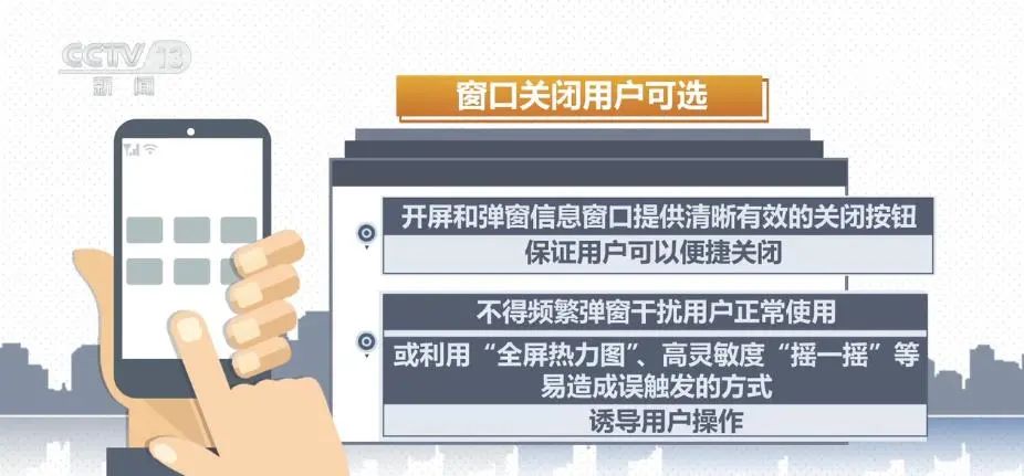 對此,工業(yè)和信息化部在此次發(fā)布的通知中就提到,開屏和彈窗信息窗口要提供清晰有效的關(guān)閉按鈕,保證用戶可以便捷關(guān)閉。不得頻繁彈窗干擾用戶正常使用,或利用“全屏熱力圖”、高靈敏度“搖一搖”等易造成誤觸發(fā)的方式誘導(dǎo)用戶操作。