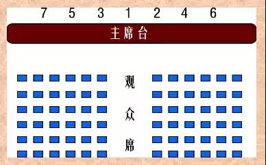 主席臺座次排列,領(lǐng)導(dǎo)為單數(shù)時,主要領(lǐng)導(dǎo)居中,2號領(lǐng)導(dǎo)在1號領(lǐng)導(dǎo)左手位置,3號領(lǐng)導(dǎo)在1號領(lǐng)導(dǎo)右手位置;可參見下圖的座次排列圖: