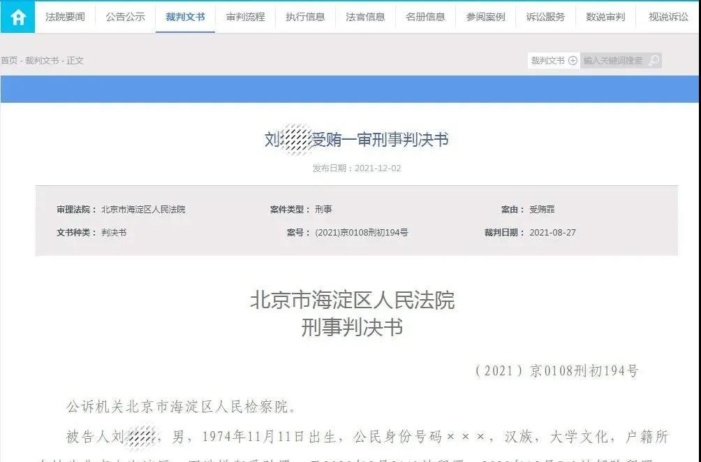 被告人劉某某,男,1974年11月11日出生,公民身份號(hào)碼xxx,漢族,大學(xué)文化,戶籍所在地為北京市海淀區(qū)。因涉嫌犯受賄罪,于2020年9月21日被留置,2020年12月7日被解除留置,當(dāng)日被取保候?qū)彙?/p>