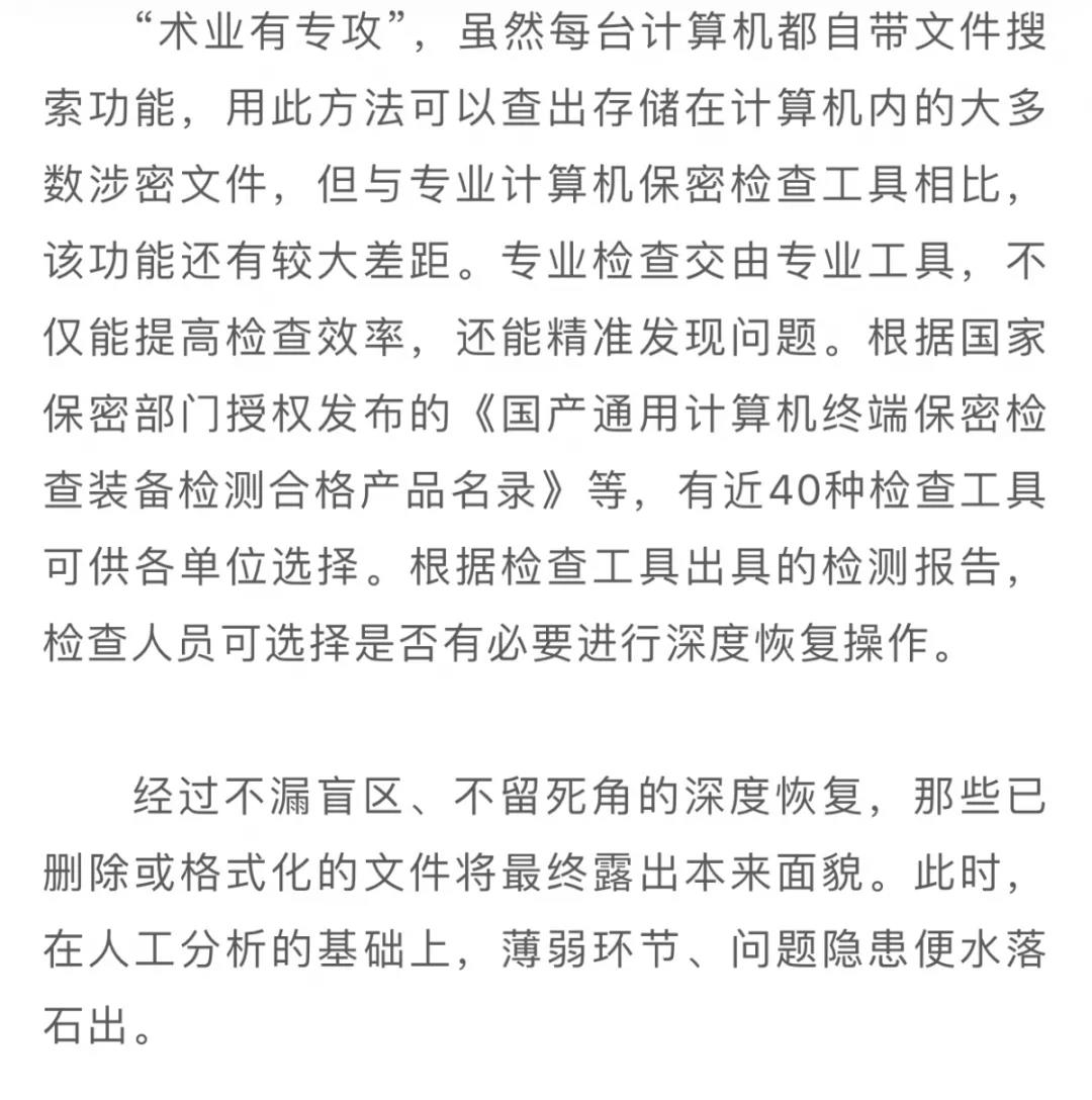 在工作實踐中,不少單位檢查人員都曾遇到這樣的尷尬瞬間,自己明明檢查過的計算機(jī)突然被上級保密部門發(fā)現(xiàn)問題,當(dāng)單位領(lǐng)導(dǎo)、同事臉上布滿陰云的時候,那種滋味簡直難以形容……上級保密部門為何技高一籌?這里,結(jié)合工作經(jīng)驗總結(jié)提煉四個錦囊,希望能助力不同專業(yè)、不同部門的有關(guān)人員提升保密檢查能力。
