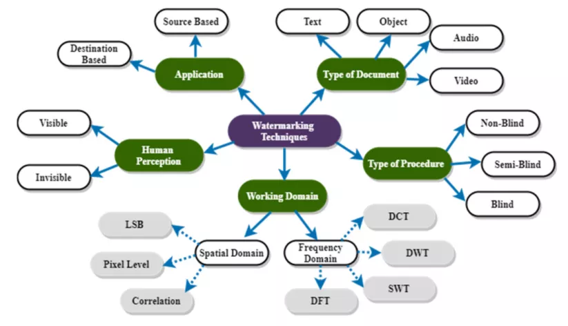根據(jù)文件類型(圖像、文本、視頻和音頻))對不同水印進行分類的方法被設計來增加透明度和持久性。水印技術分為以下幾種主要類型(見圖2)。