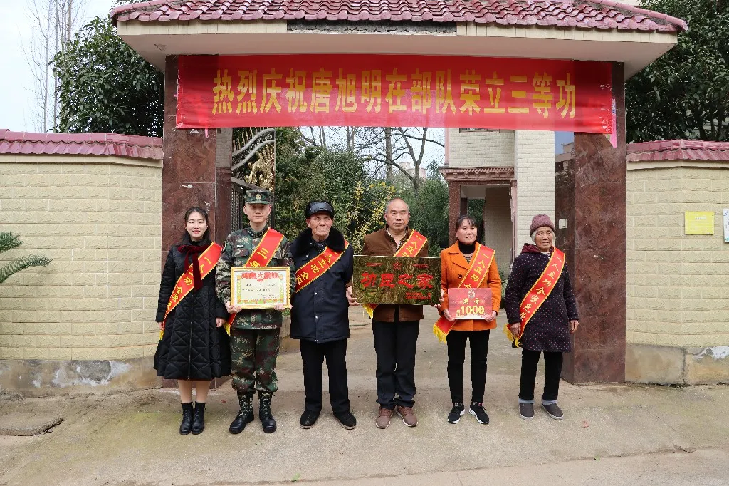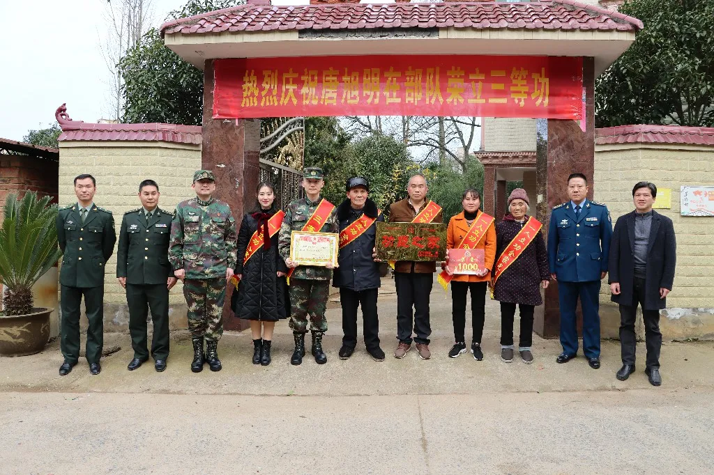 熱熱鬧鬧送喜報(bào),十里八鄉(xiāng)傳美談。日前,湖南永州東安縣人武部、退役軍人事務(wù)局相關(guān)負(fù)責(zé)人和火箭軍某部代表一行來(lái)到白牙市鎮(zhèn)蓮塘村,為榮立三等功的現(xiàn)役軍人唐旭明送去立功喜報(bào)。