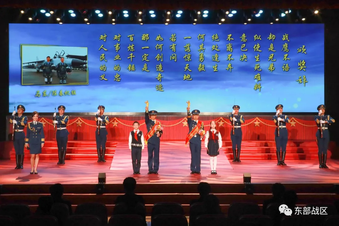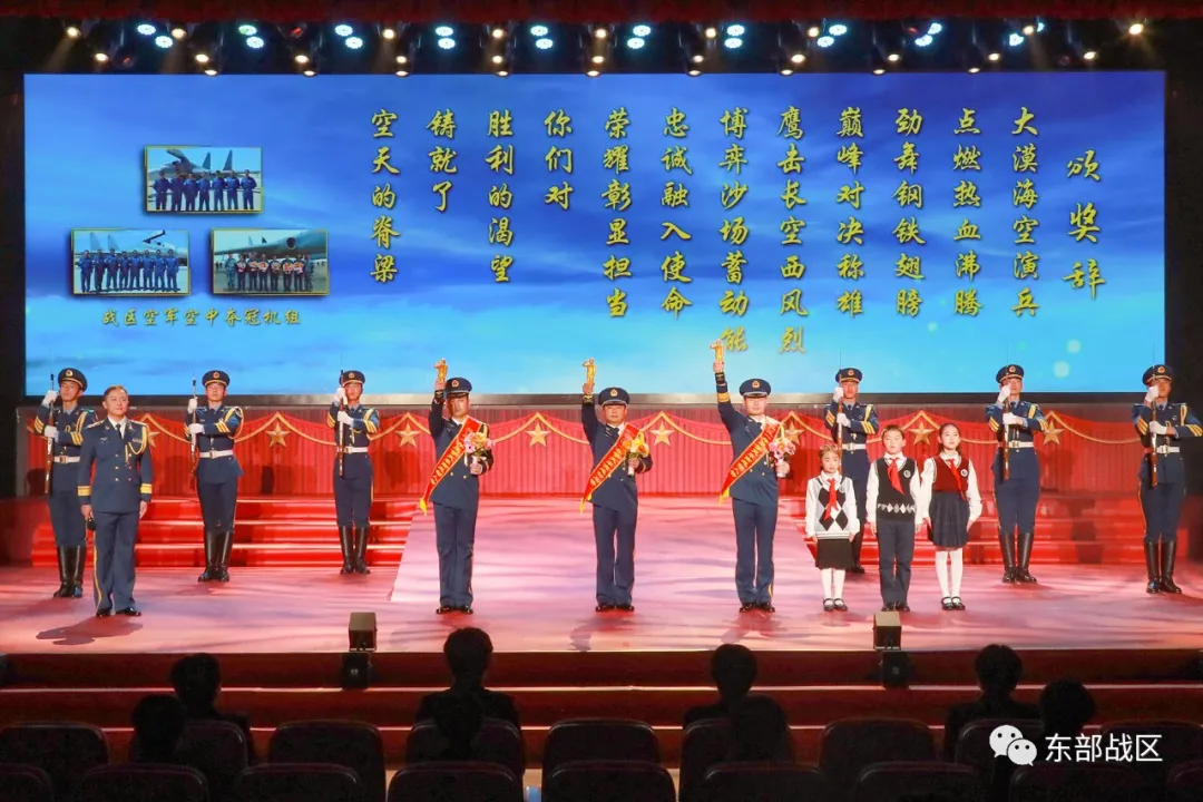開場舞《逐夢藍(lán)天》洋溢著蓬勃朝氣,拉開了頒獎典禮的序幕。主題“戰(zhàn)旗在云端高揚”7個金色大字在紅色舞臺映襯下莊重激揚,一側(cè)紅旗漫卷、戰(zhàn)鷹高飛的“擎天東南”雕塑熠熠生輝,傳遞著對典型榜樣最深情的禮贊。