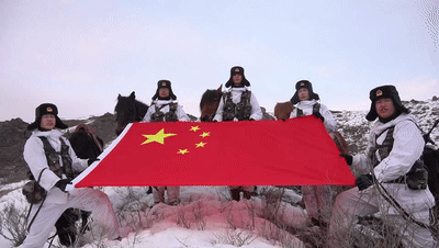 冬季巡邏,陡峭的巖石被積雪覆蓋,稍有不慎就會(huì)人仰馬翻。有著防區(qū)“活地圖”之稱的四級(jí)軍士長趙志明高舉國旗走在隊(duì)伍最前面,鼓勵(lì)大家咬牙堅(jiān)持。
