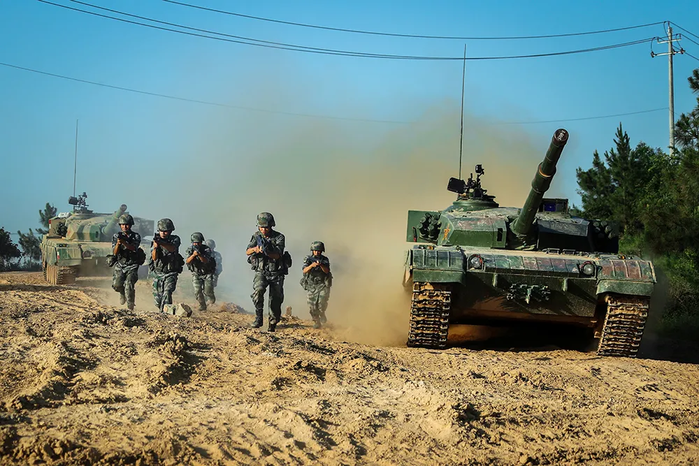 ▲“濟南第一團”官兵在對抗演習中奮勇沖鋒。