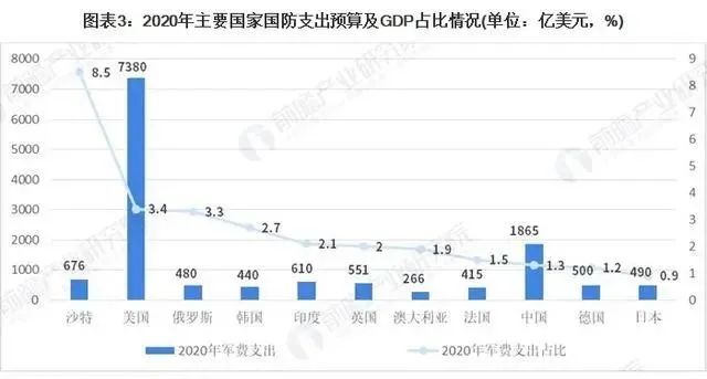 2020年主要國家國防支出預(yù)算中,美國依然高居首位,為7380億美元,比排名第2位至第10位的各國國防預(yù)算總和還多;其次依次是中國、沙特、印度以及美國。2020年世界五強(qiáng)國家軍費(fèi)總和為11082億美元。