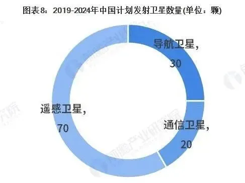 根據(jù)《中國航天科技活動藍(lán)皮書(2018)》規(guī)劃,2019-2024年,我國將發(fā)射約120顆衛(wèi)星,其中包括通信衛(wèi)星20顆左右、遙感衛(wèi)星70顆左右、導(dǎo)航衛(wèi)星30顆左右。