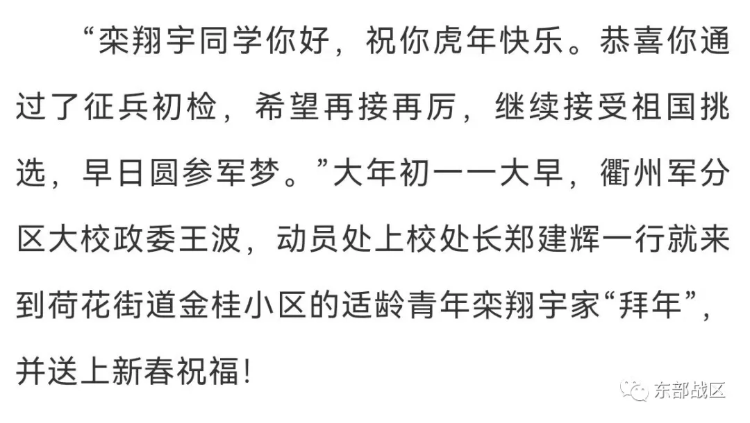 為進(jìn)一步提升兵員質(zhì)量,為鋼鐵長城挑選“優(yōu)質(zhì)磚”,虎年大年初一,浙江省衢州軍分區(qū)百名征兵人就開始行動(dòng)起來,進(jìn)千家,訪“新兵”。