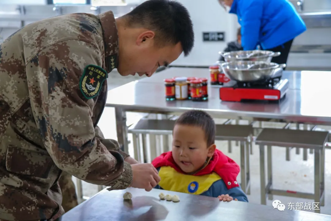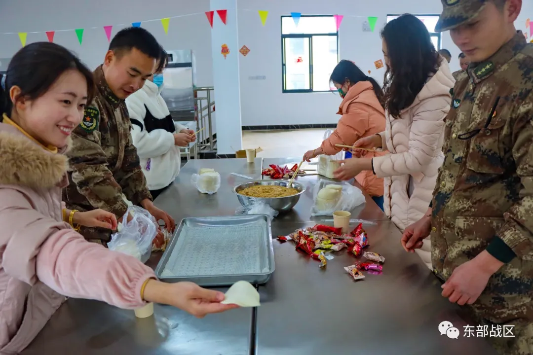 和官兵們一起動手拌餡、捏皮