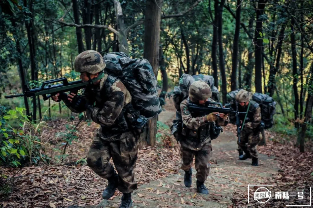 “全班注意,防空襲”,正當(dāng)小組隊員在道路上行進(jìn)時,先遣隊員發(fā)出警告。隨后組長立即判斷情況,迅速隱蔽,處置了演練途中的“敵情”。