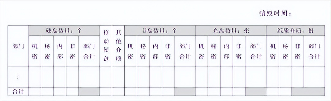 銷毀臺賬的建立沒有固定格式,可包括:部門、各類介質(zhì)(硬盤、U盤、光盤、紙質(zhì)品及其他載體)銷毀數(shù)量、銷毀時間、統(tǒng)計結(jié)果等。