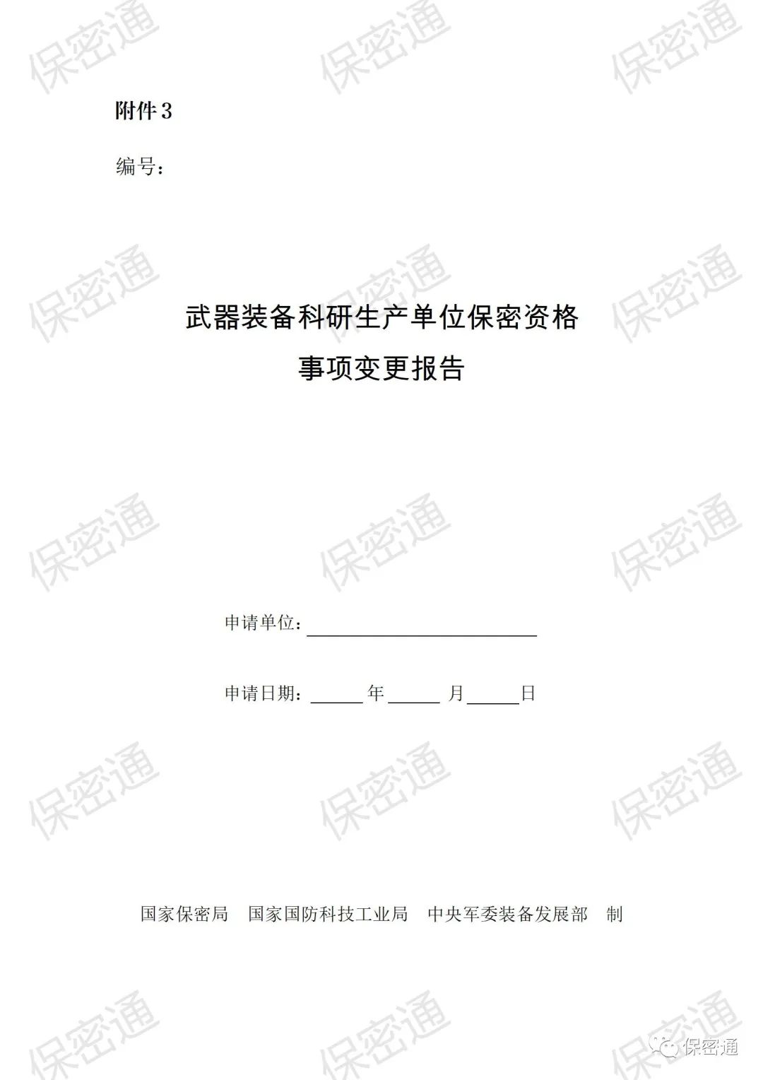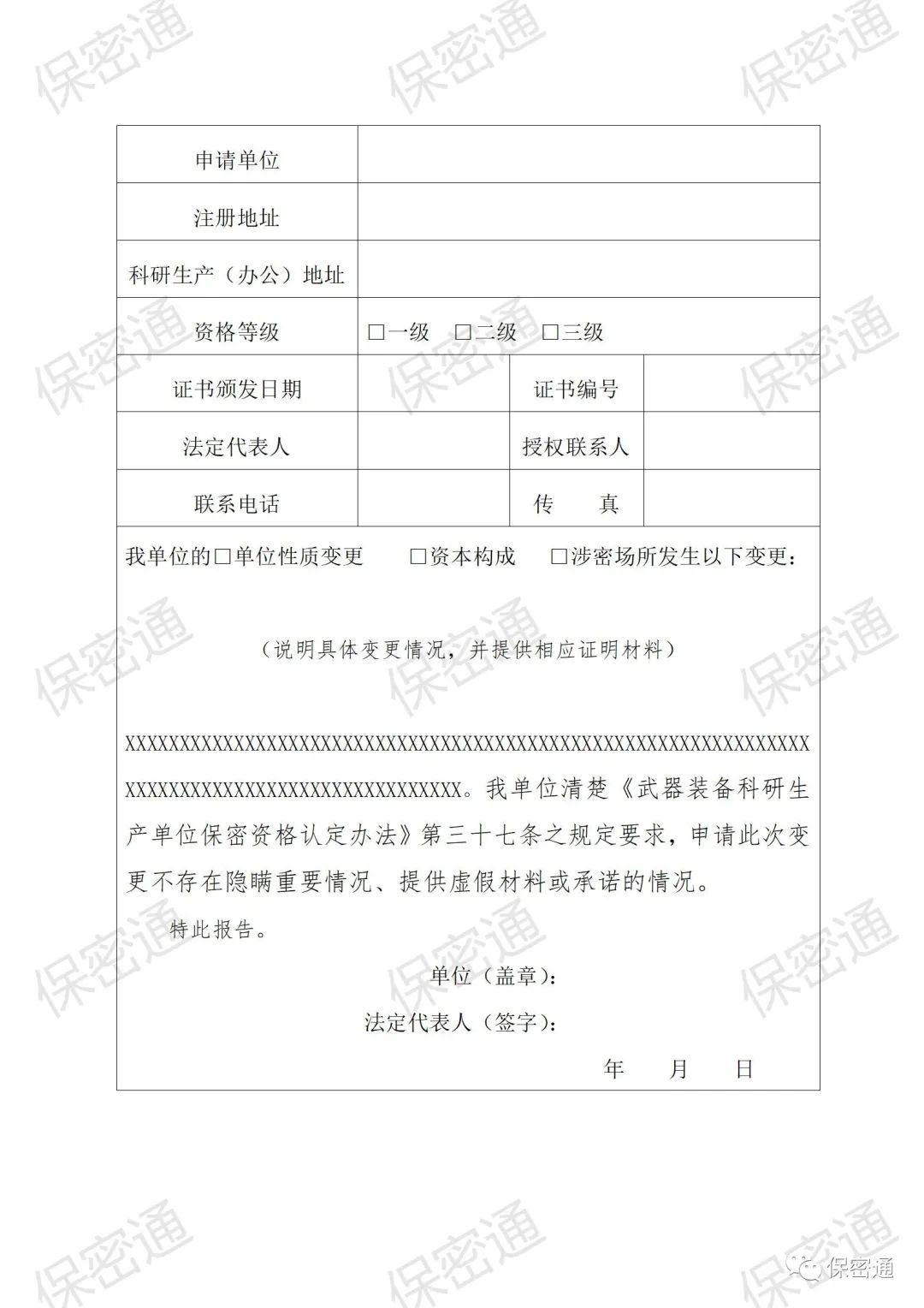 說明材料如第①②項不滿足,認(rèn)定辦將按照《軍工認(rèn)定辦法》第十三條和第三十九條之規(guī)定,撤銷其保密資格,并收回保密資格證書。如第③項不滿足,不予受理,單位應(yīng)按照《軍工認(rèn)定辦法》第三十四條之規(guī)定重新申請;如單位資本構(gòu)成有一定變化,實際控制權(quán)未發(fā)生轉(zhuǎn)移,新增股東和新增資本符合《軍工認(rèn)定辦法》第十三條規(guī)定,需另行提供保密資格事項變更報告(見附件3),并附變更具體說明等。